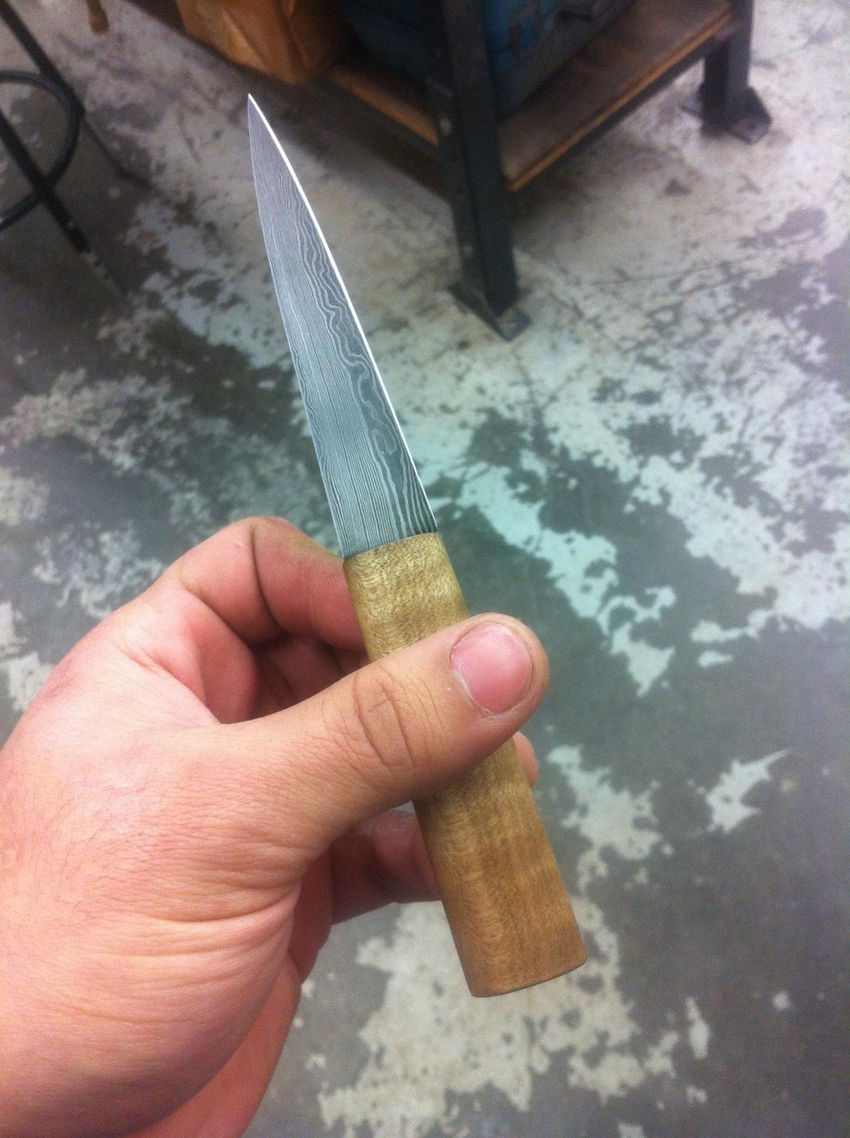 It is a small knife that fits well into the hand and sports a thick spine and keen edge. It is one of the simpler looking knives I have made but has a real simplistic beauty to it.