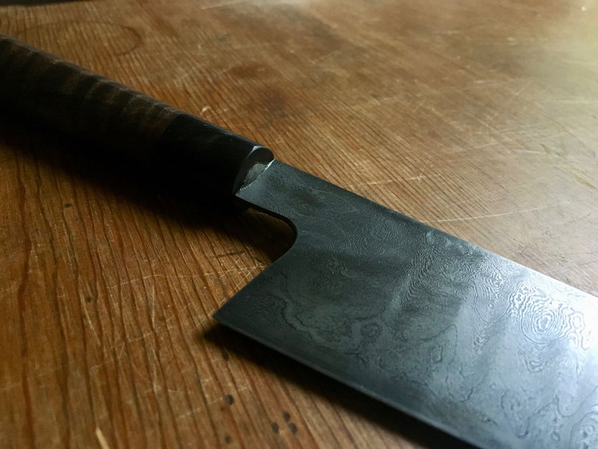 A densely patterned Sujihiki made from modern steels. It has around 450 layers of 15n20 and 1084 that are manipulated to create a chatoyant pattern. The shape is modeled closely after the Japanese Sujihiki, a knife meant for breaking down and filleting tuna. Its handle is made from curly koa and water buffalo horn and features a traditional D shaped cross section, meant for a right handed user. The blade is 9 inches long, the handle is 6 inches long and it weighs 4.6 ounces. This knife is very light, thin, and well balanced with a wickedly sharp edge.