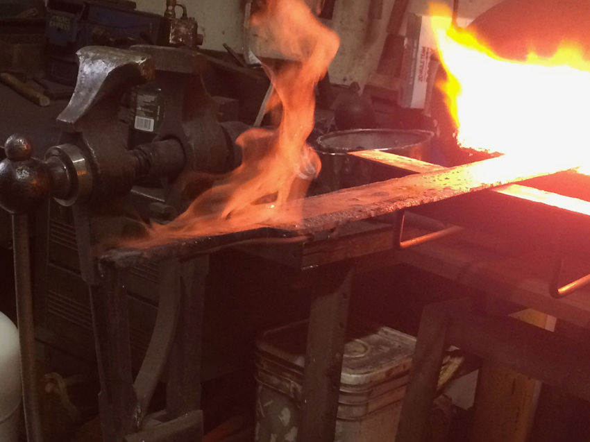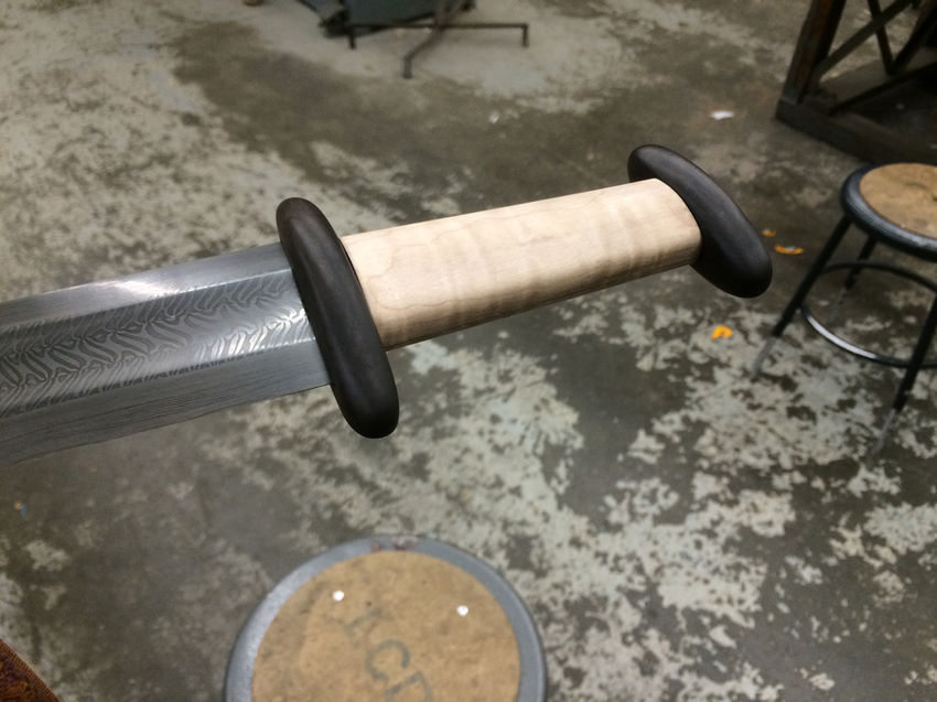 This piece is based on a German sword from the Vendel period. The original has a slightly hexagonal grip with gold foil wrapped over one side. The blade is about the same length with a forged fuller running almost the full length of the blade. The edges are around 300 layers of steel with three twisted and countertwisted bars in the central part of the fuller. The handle is maple with blackwood guards and a wrought iron peen block.